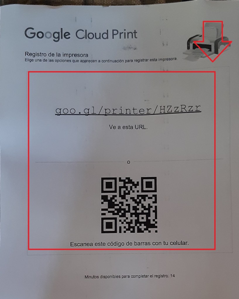 En la hoja impresa copiamos el link o si es con el dispositivo tomar foto al código QR. Link: http://goo.gl/printer/zwmpQo.