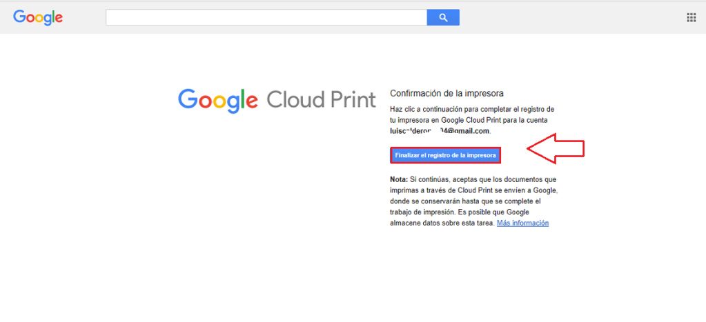 Al ingresar los datos solicitados. Dar clic en Finalizar el registro para que vincule nuestra cuenta Google a nuestra impresora.