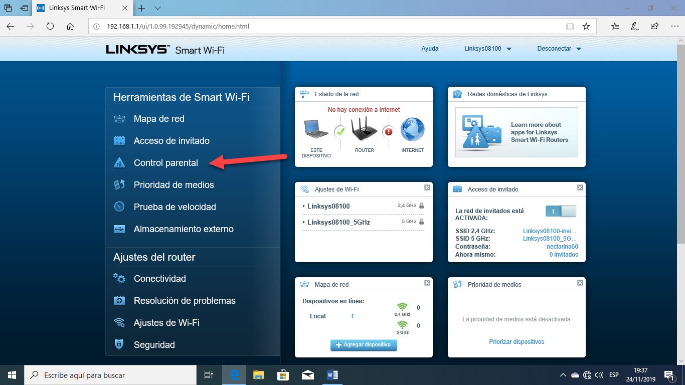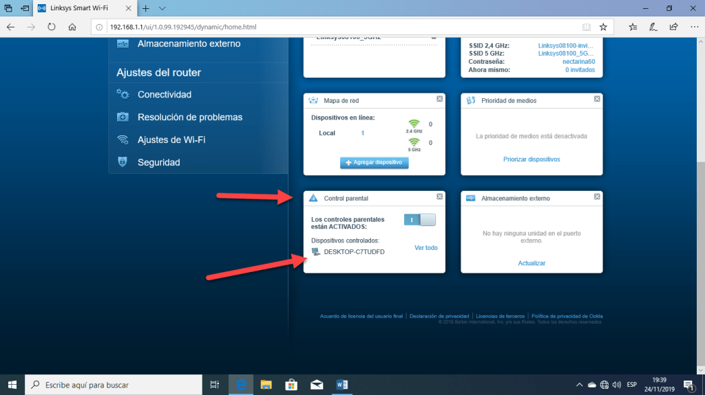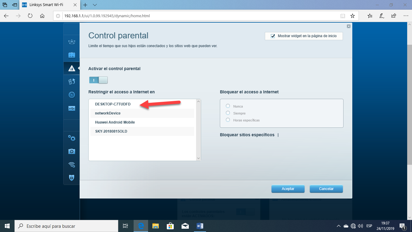 Luego nos enviara al portal de configuración donde podemos ver el espacio donde muestra control parental y en el se encuentra un dispositivo.