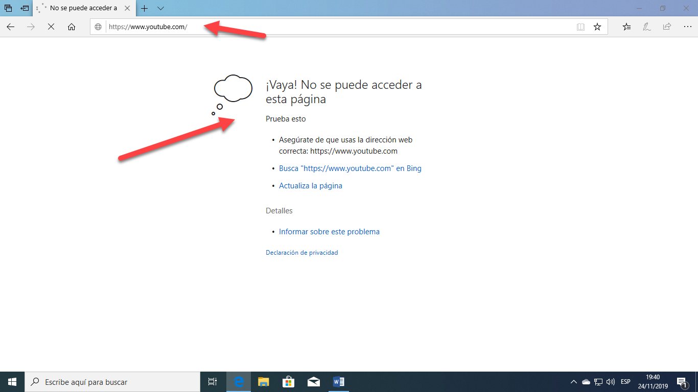 Para confirmar el bloqueo de la página, abra el navegador y escriba la pagina restringida. (en el ejemplo http://www.yotube.com)