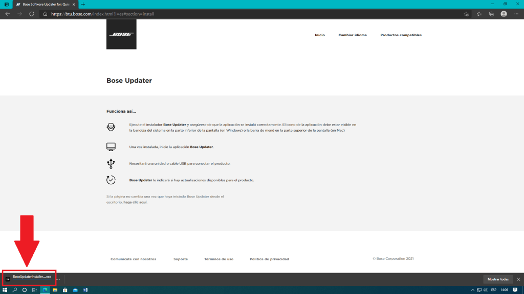 Al realizar los pasos anteriores automáticamente iniciara la descarga de la utilidad «BoseUpdaterInstaller.exe» la cual cuando finalice debemos de ejecutar dando clic en el archivo descargado.