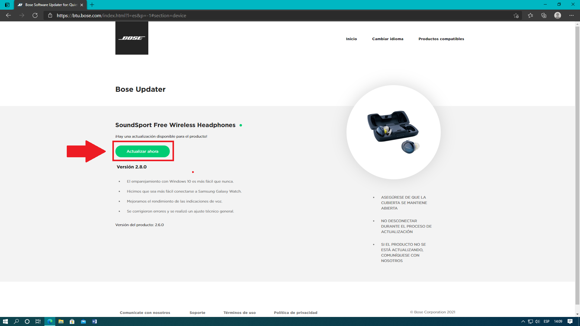 La página se actualizará y nos dará la opción de actualizar el firmware y la versión más reciente disponible, abrimos la cubierta de nuestros audífonos y luego damos clic en el botón “Actualizar ahora”.