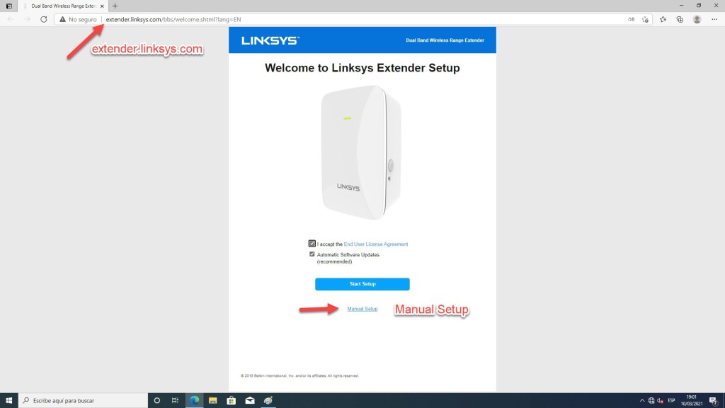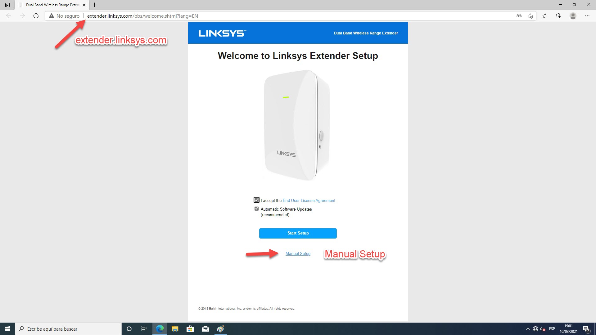 Abrimos el navegador y en la barra de dirección escribimos el siguiente link: “extender.linsys.com”, y presionamos la tecla “enter”, hacemos clic en “manual setup”, para continuar con las configuraciones.