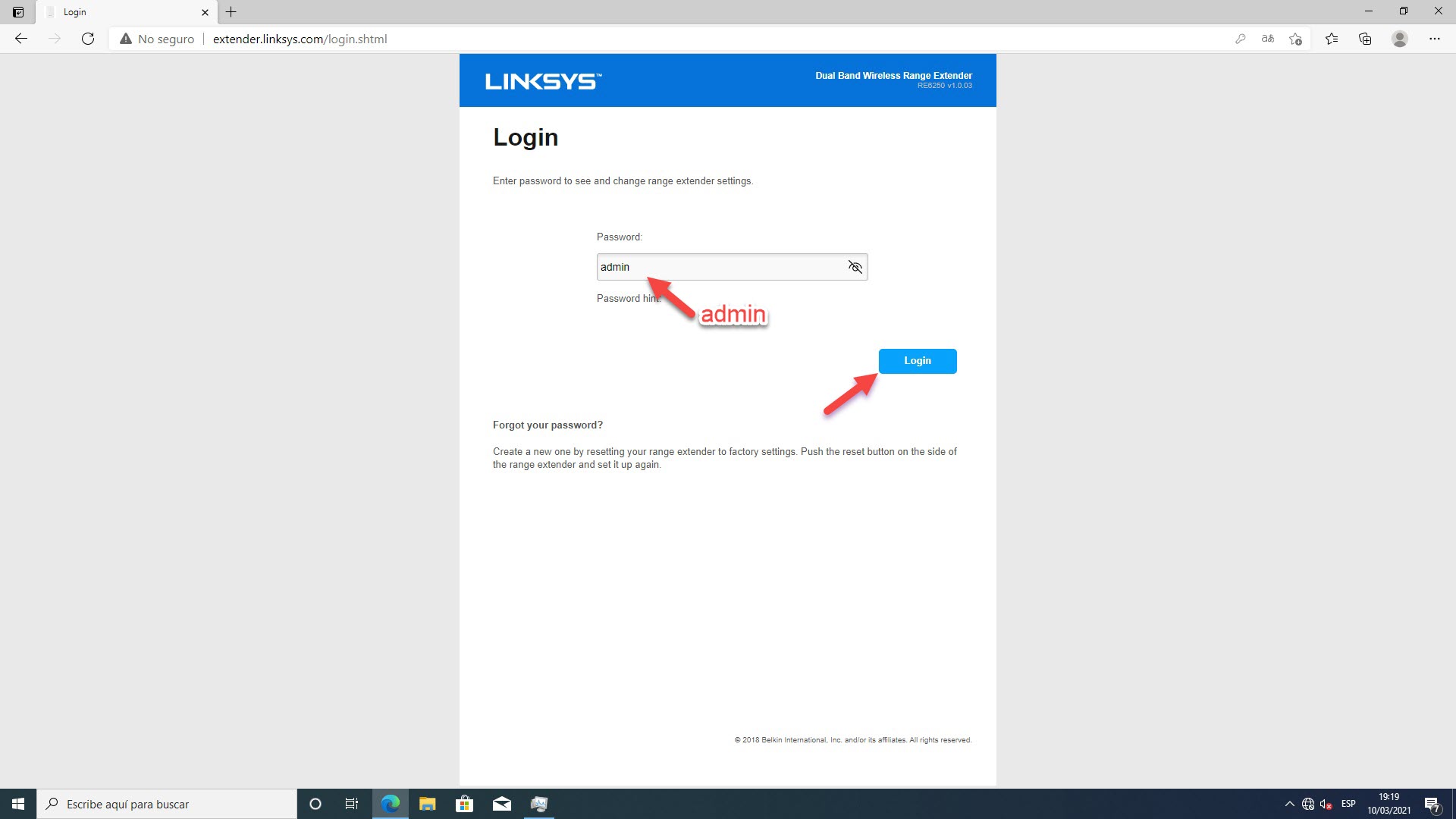 Escribimos la contraseña para ingresar al menú de configuraciones, la cual viene predeterminada de fabrica “admin” y luego damos clic en “Login”.