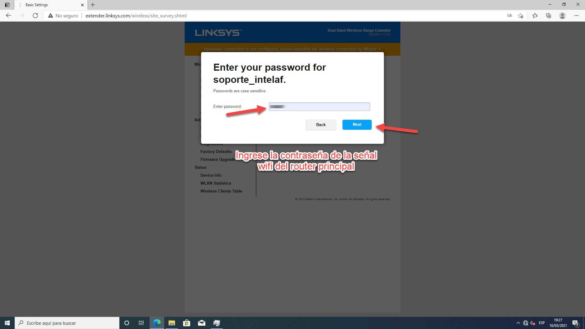 Seleccionamos la red WiFi que deseamos repetir. Ingresamos la contraseña de la red WiFi y damos clic en “Nexxt”.
