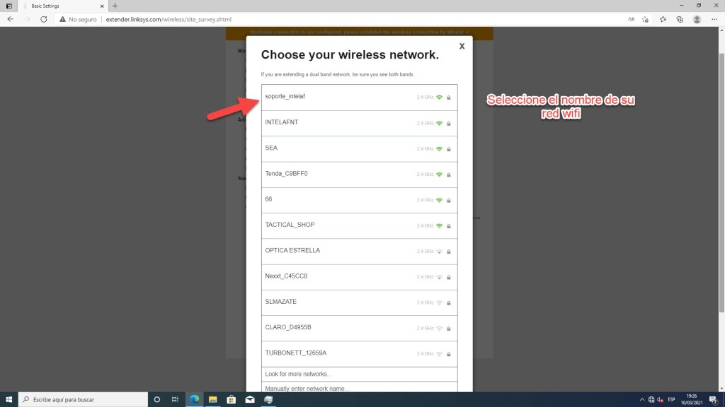 Como primer paso es necesario que el dispositivo esté conectado al toma corriente. Buscamos la señal inalámbrica que emite nuestro Extensor Linksys RE6250 desde nuestro computador. Nos conectamos a la red abierta que aparece con el nombre “Linksys Extender Setup”.