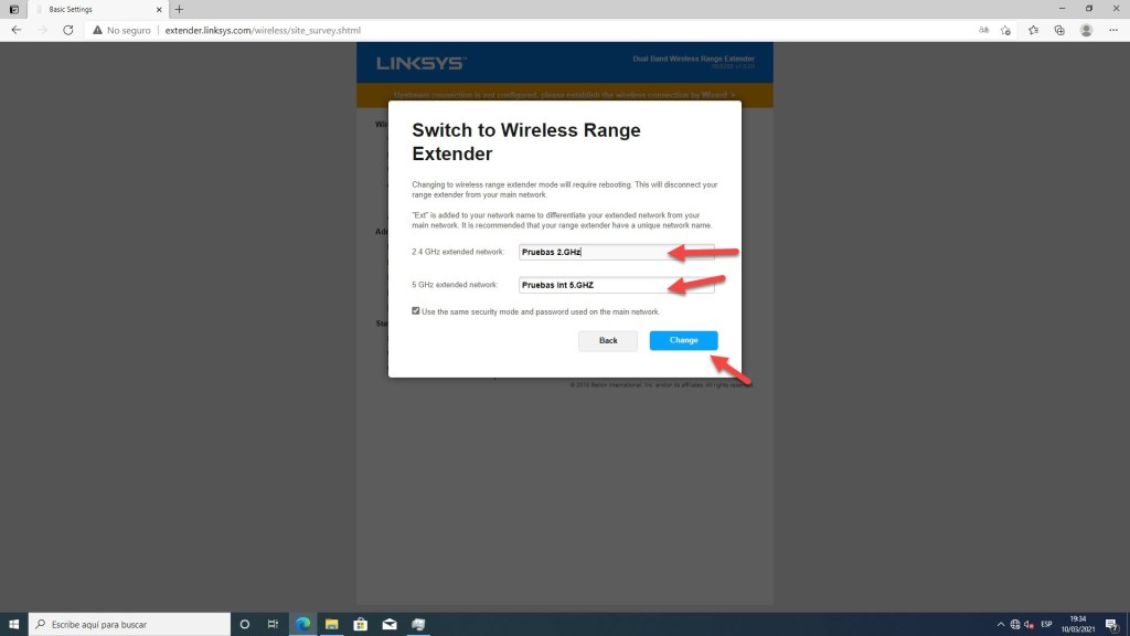 A continuación, podemos cambiar el nombre de las redes que serán emitidas por nuestro Extensor Linksys RE6250. Luego de ingresar el nombre deseado hacemos clic en “Change”.