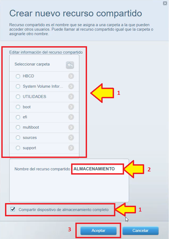 Seleccionamos que carpetas de nuestro almacenamiento que queremos compartir o también podemos seleccionar compartir toda la unidad. Ingresamos el nombre que le colocaremos al recurso compartido y damos clic en “Aceptar”.