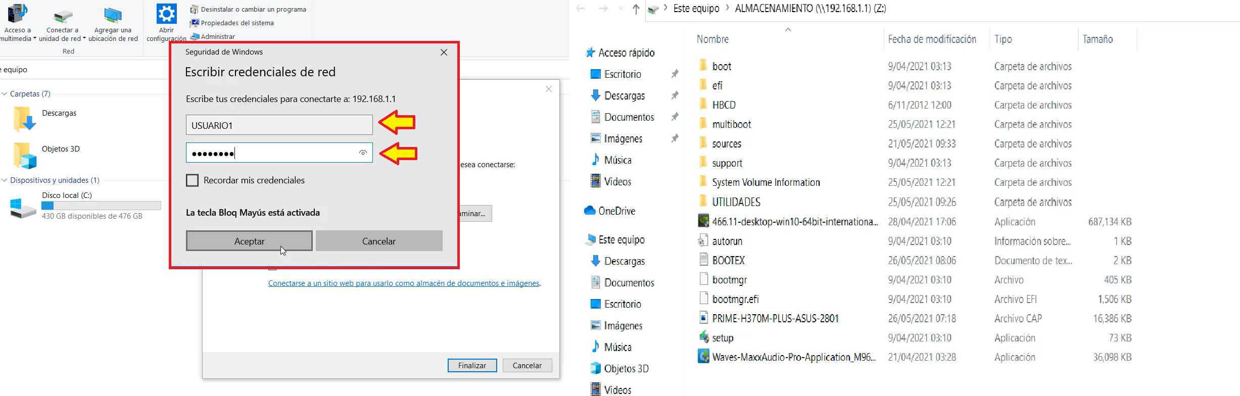 Ingresamos las credenciales del usuario y contraseña configurados anteriormente, luego damos clic en “Aceptar”, por último, confirmamos que nos permita ingresar al almacenamiento compartido conectado a través de nuestro puerto USB.
