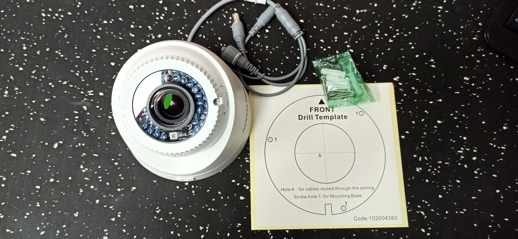 Lo primero que veremos es el contenido de nuestra caja, esta incluye la cámara, una plantilla para realizar las perforaciones en el lugar correcto y un juego de tarugos y tornillos para la fijación de la cámara.