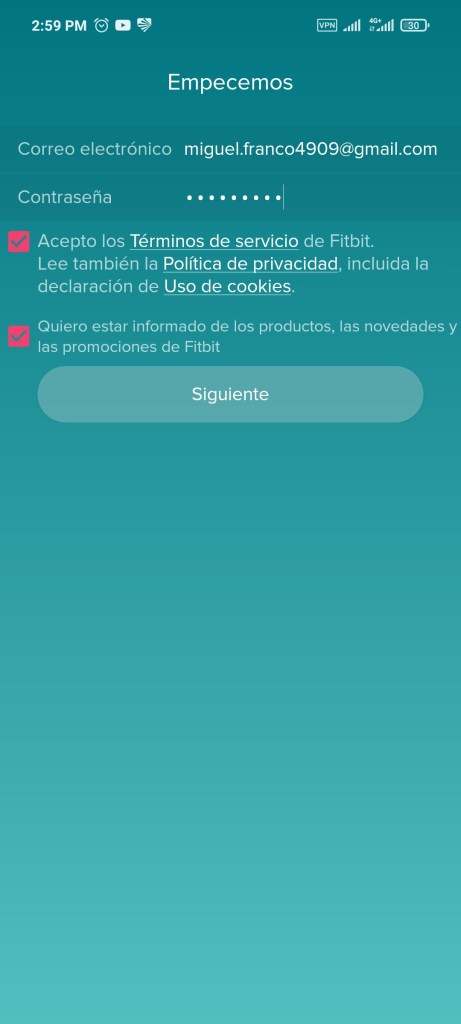 Creamos una cuenta de Fitbit ingresando nuestro correo electrónico, contraseña y aceptamos las condiciones de uso.