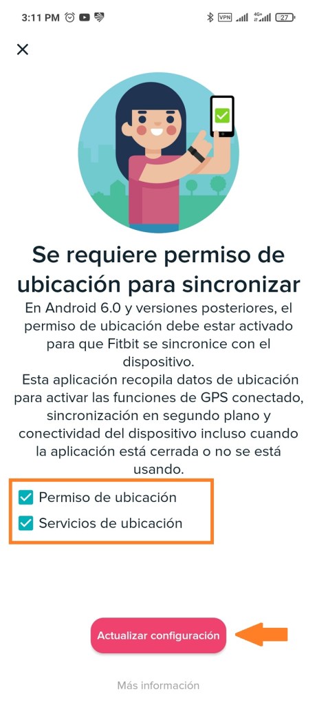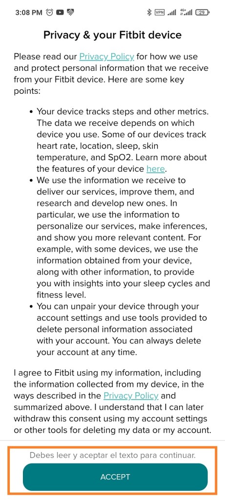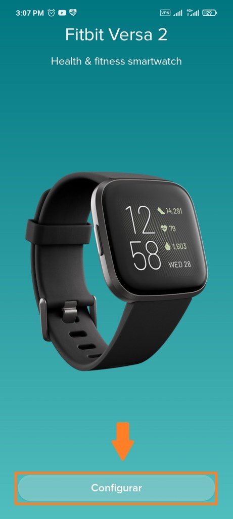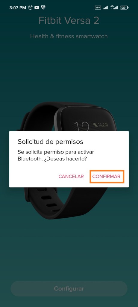 En la aplicación Fitbit seleccionamos “Configurar”, confirmamos los permisos que se requieran y aceptamos la política de privacidad.