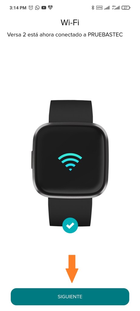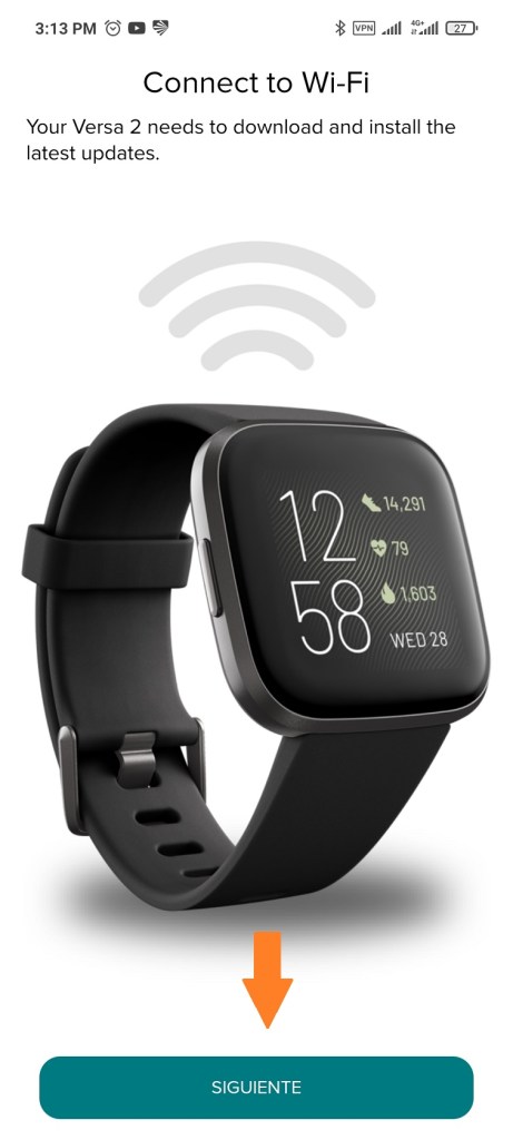 Conectamos nuestro reloj Fitbit Versa 2 en la base de carga y el otro extremo a un puerto USB de nuestra PC o laptop. Una vez realizado regresamos a la aplicación Fitbit y seleccionamos “Siguiente”.