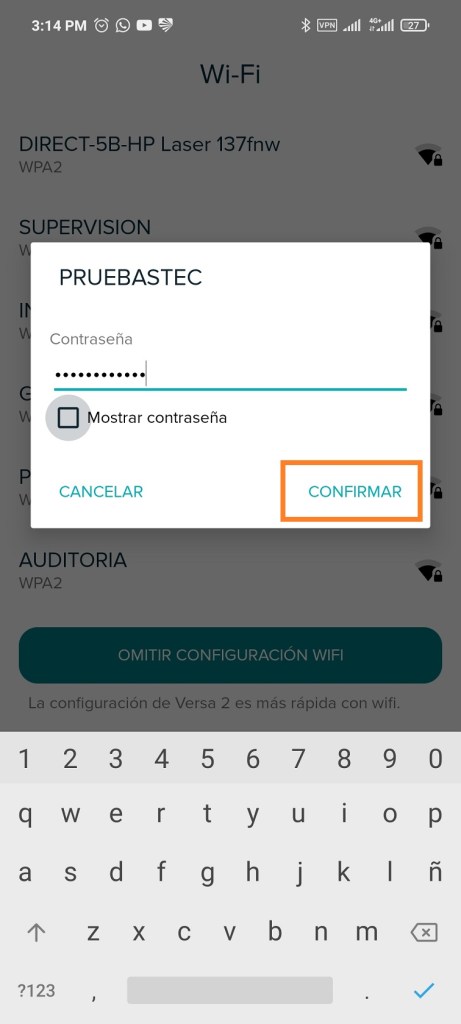 Como siguiente paso vamos a conectar el reloj a nuestra red Wi-Fi, seleccionamos la red inalámbrica que deseamos e ingresamos la contraseña, luego seleccionamos la opción “Confirmar”.