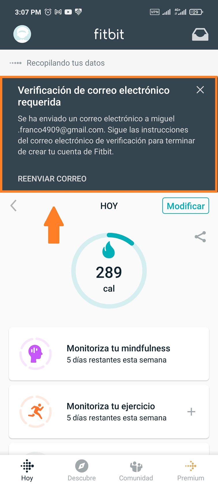 Creamos una cuenta de Fitbit ingresando nuestro correo electrónico, contraseña y aceptamos las condiciones de uso.