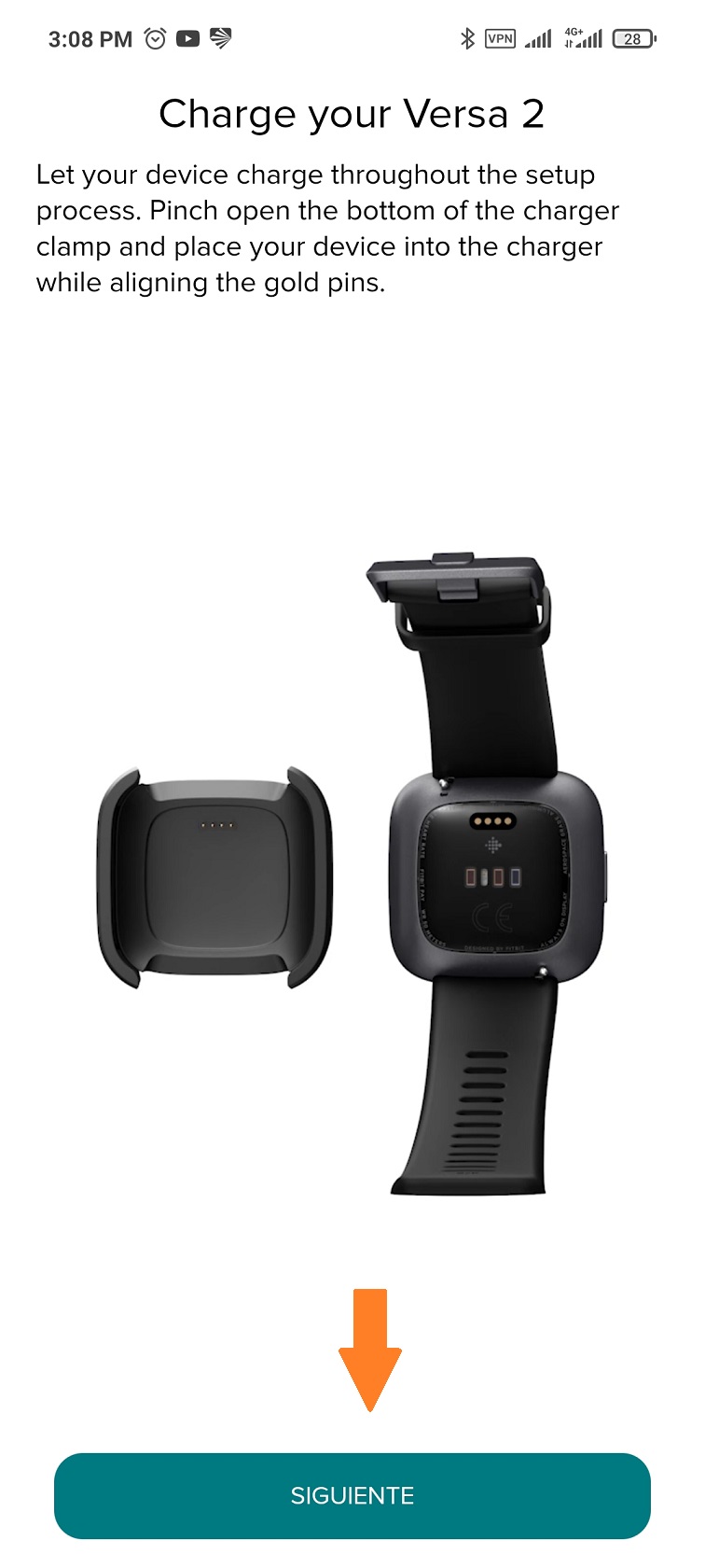 Conectamos nuestro reloj Fitbit Versa 2 en la base de carga y el otro extremo a un puerto USB de nuestra PC o laptop. Una vez realizado regresamos a la aplicación Fitbit y seleccionamos “Siguiente”.