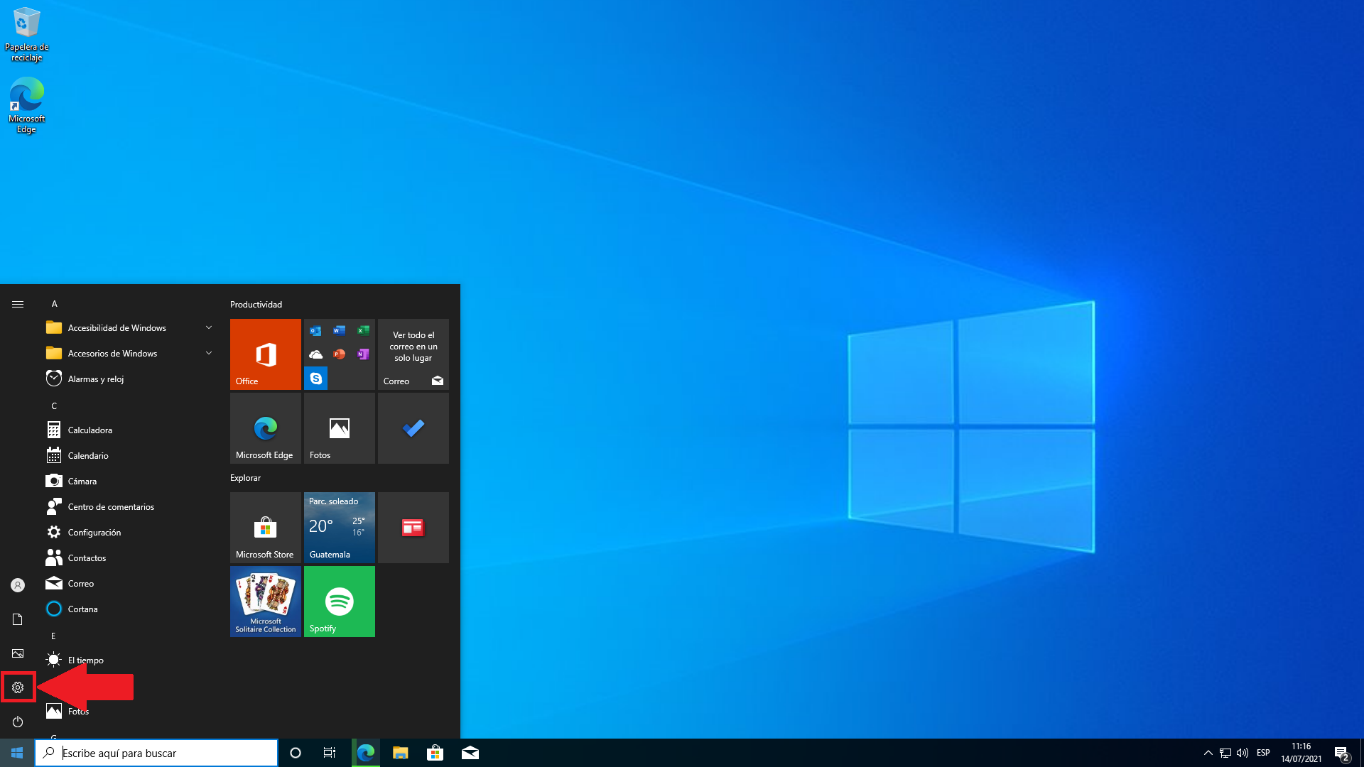Lo primero que haremos es ingresar a configuraciones, abriendo el menú de inicio y dando clic en el icono de «Configuración«.