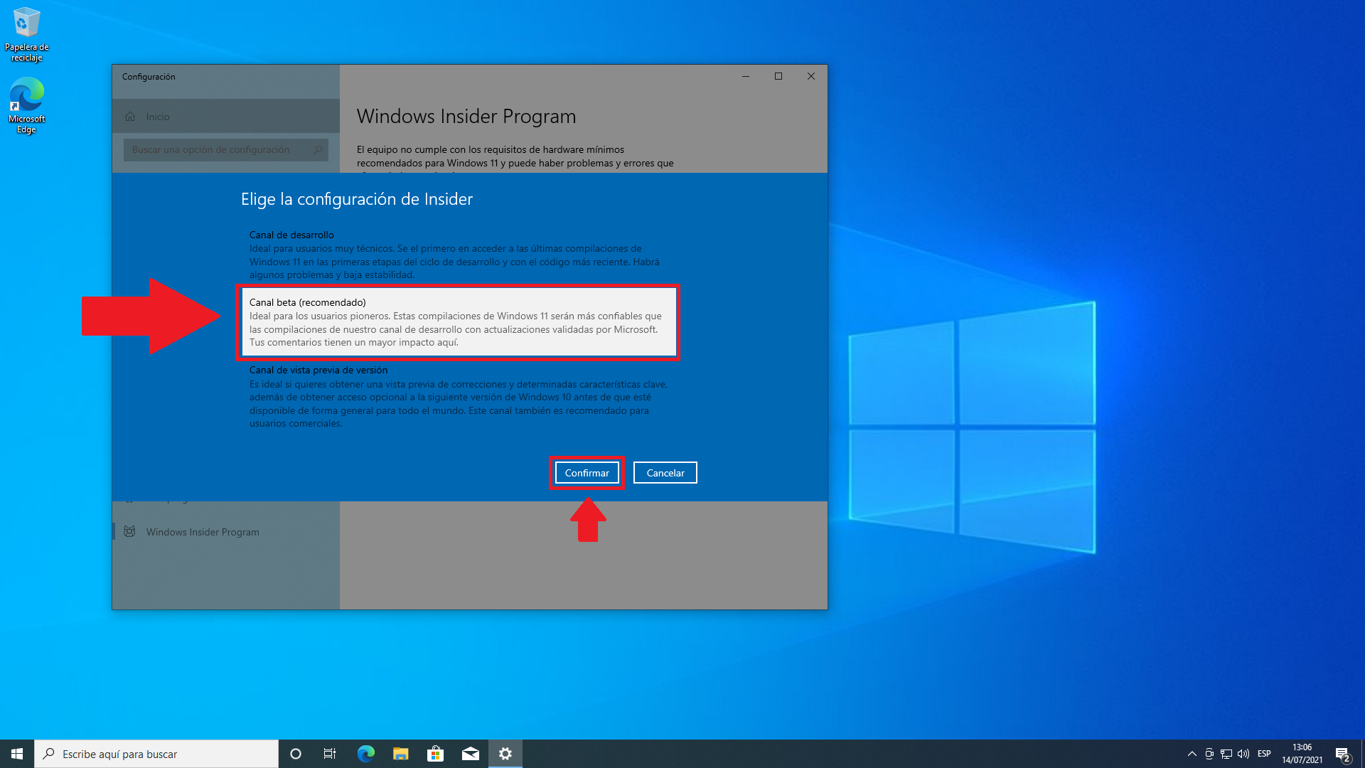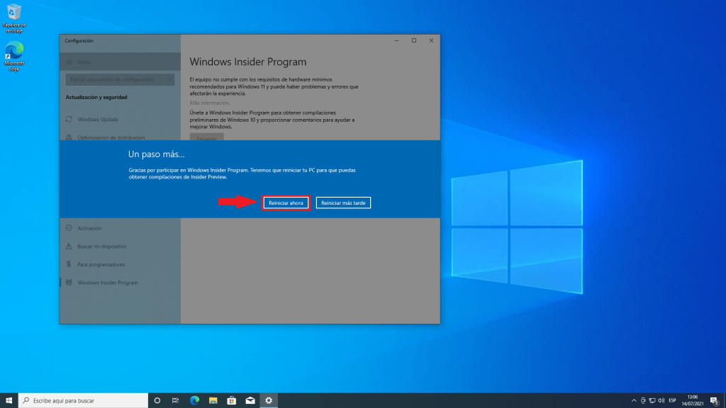 Luego de esperar un momento, podremos elegir el tipo de Insider que configuraremos, en este caso vamos a seleccionar la opción “Canal Beta”. Luego damos clic en «Confirmar» y «Reiniciar«.