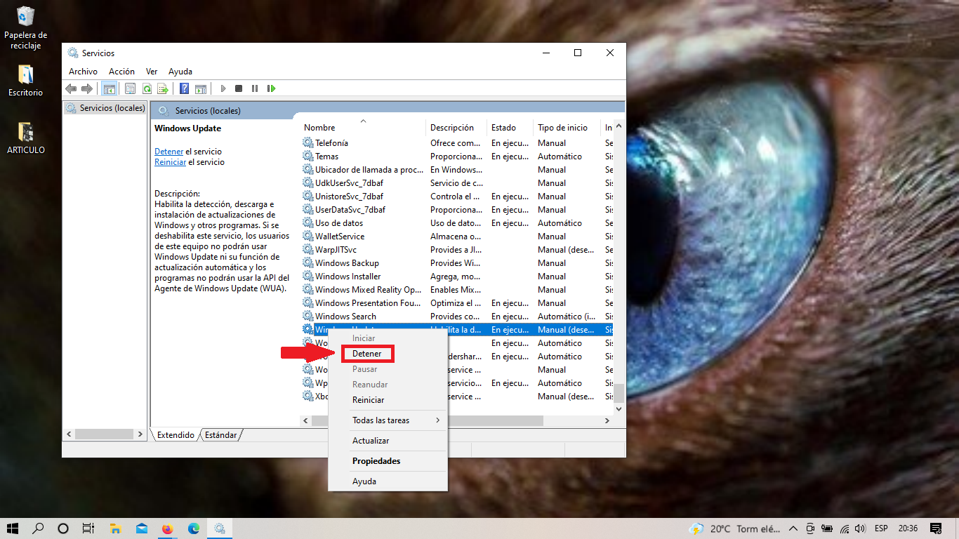 Seleccionamos y damos clic derecho en el servicio «Windows Update«.