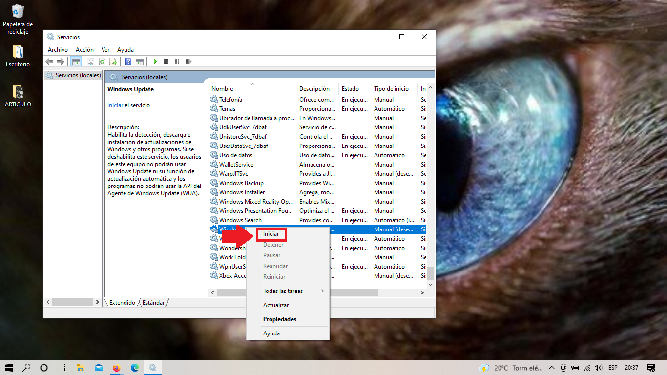 Si deseamos activar las actualizaciones, damos clic derecho sobre servicio “Windows Update” y damos clic en “Iniciar”.