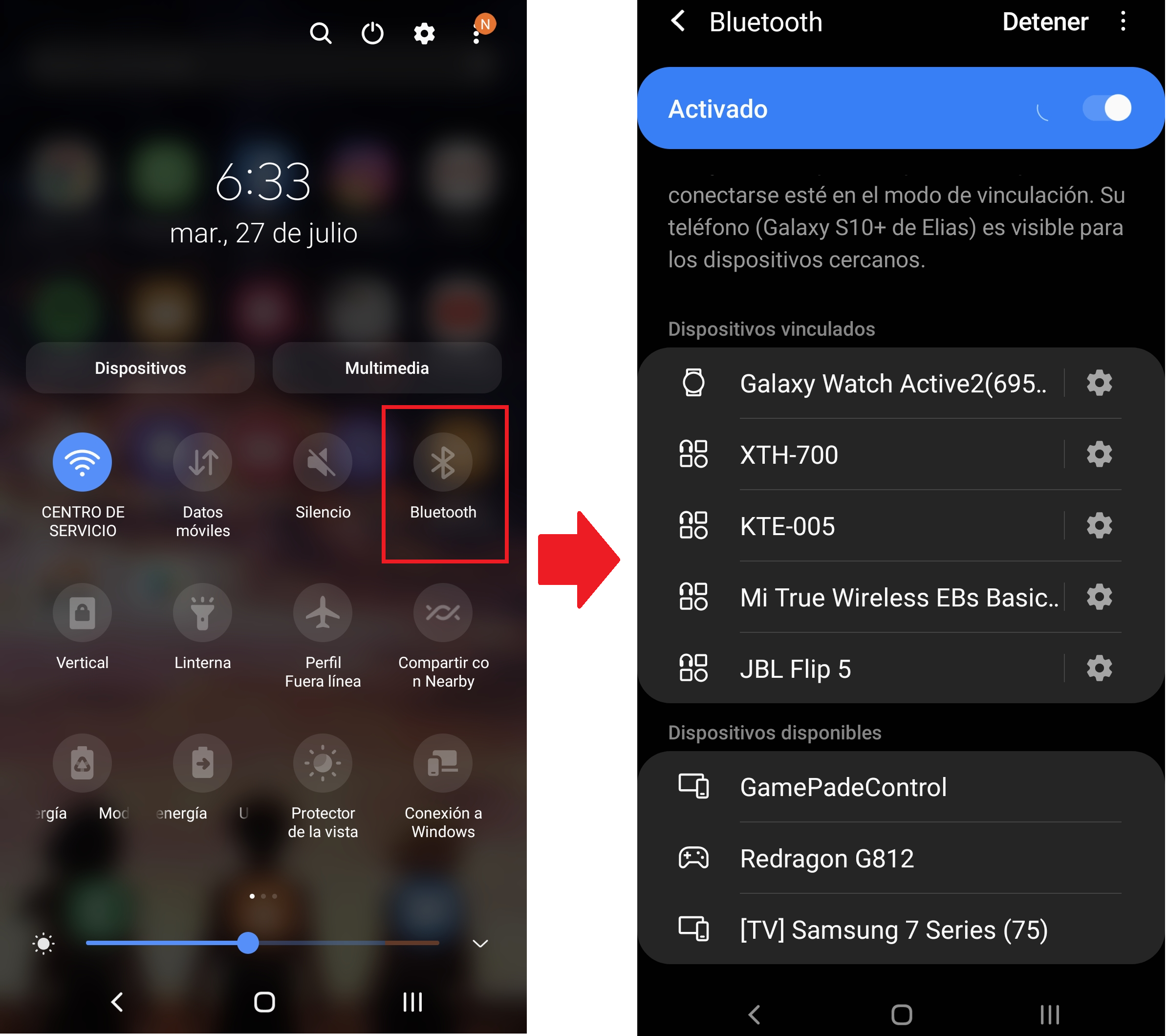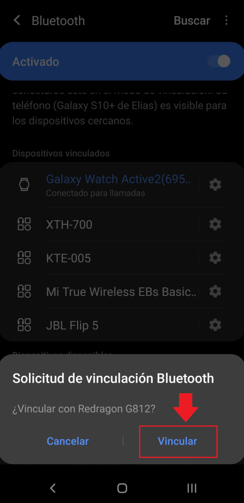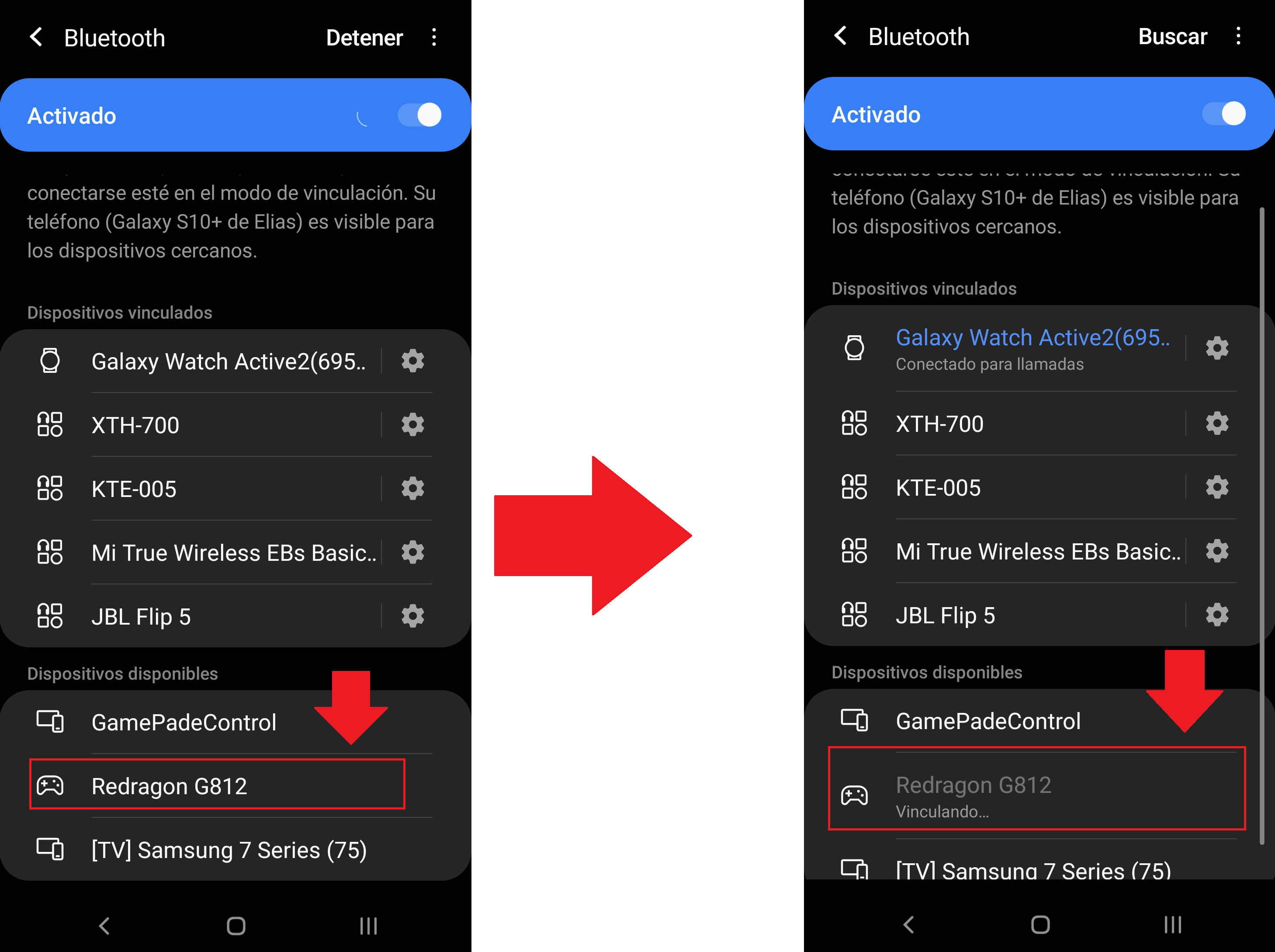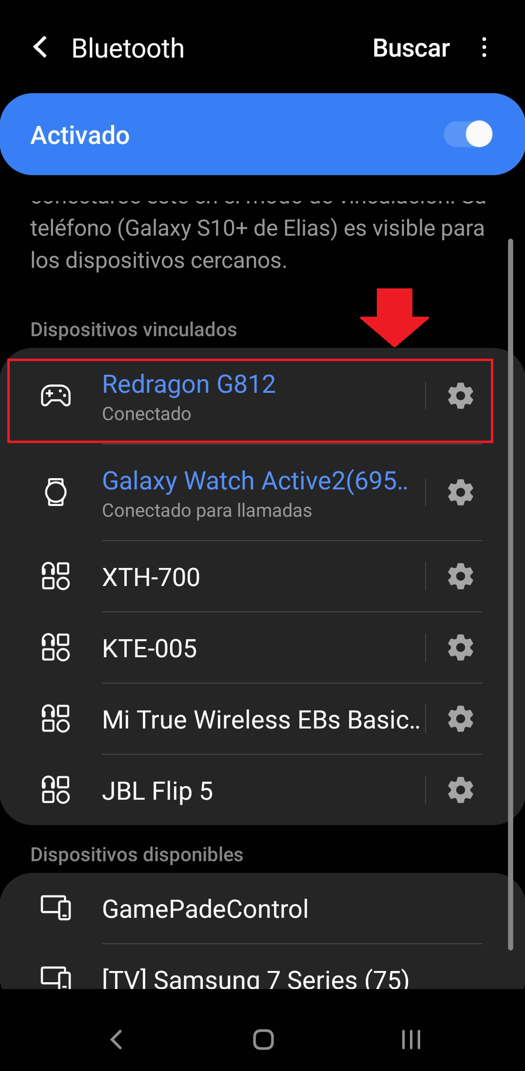 En nuestro dispositivo móvil encendemos el bluetooth y verificamos que nos aparezca el nombre de nuestro Gamepad Redragon Ceres G812, en este caso sería «Redragon G812«.