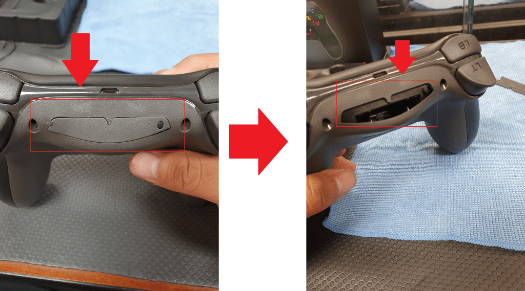 Extraemos el protector que esta en la parte trasera de nuestro Gamepad Redragon Ceres G812, lo cual nos servirá para poder insertar el soporte para nuestro dispositivo móvil.