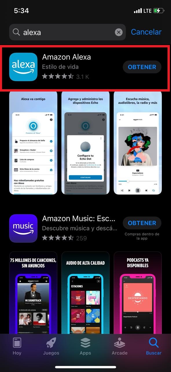 Ingresamos a nuestra tienda de aplicaciones, buscamos y descargamos la aplicación de «Alexa» y la descargamos.