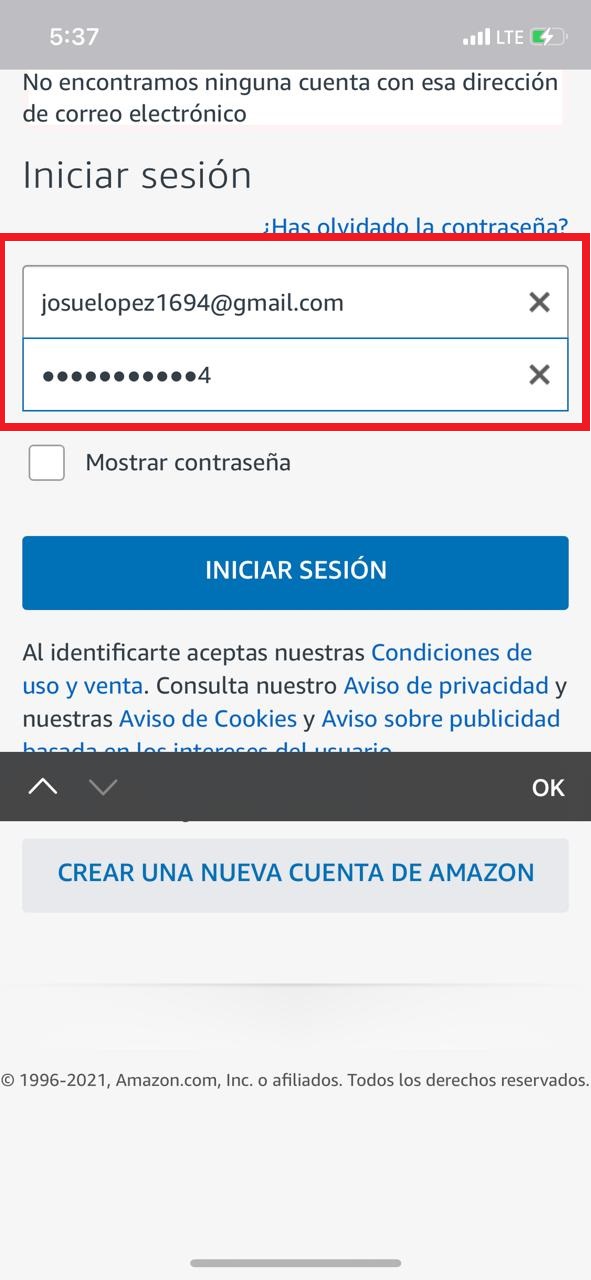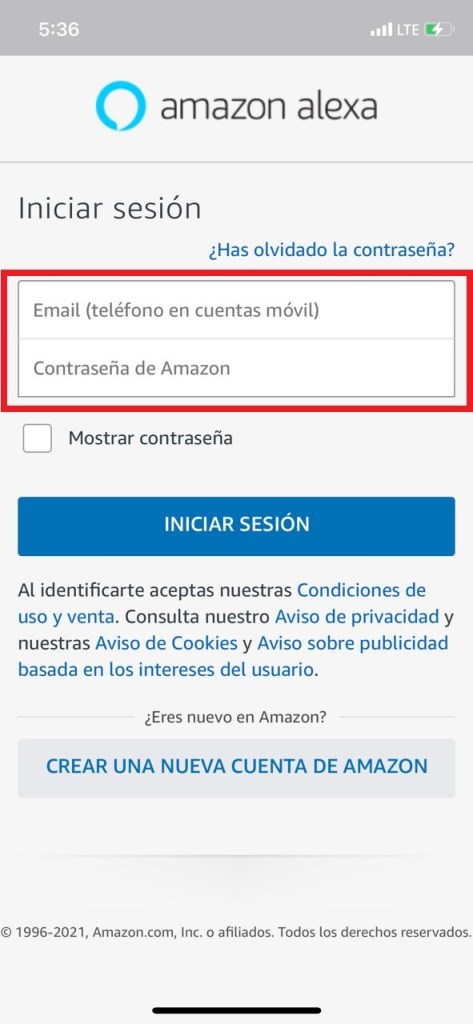 Una vez descargada la aplicación, ingresamos nuestra cuenta de Amazon, si no se posee cuenta se debe de llenar el registro.