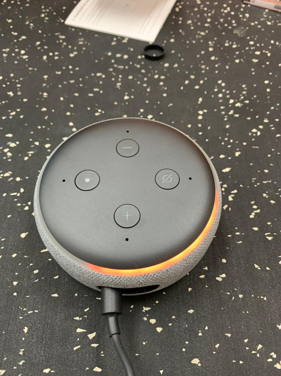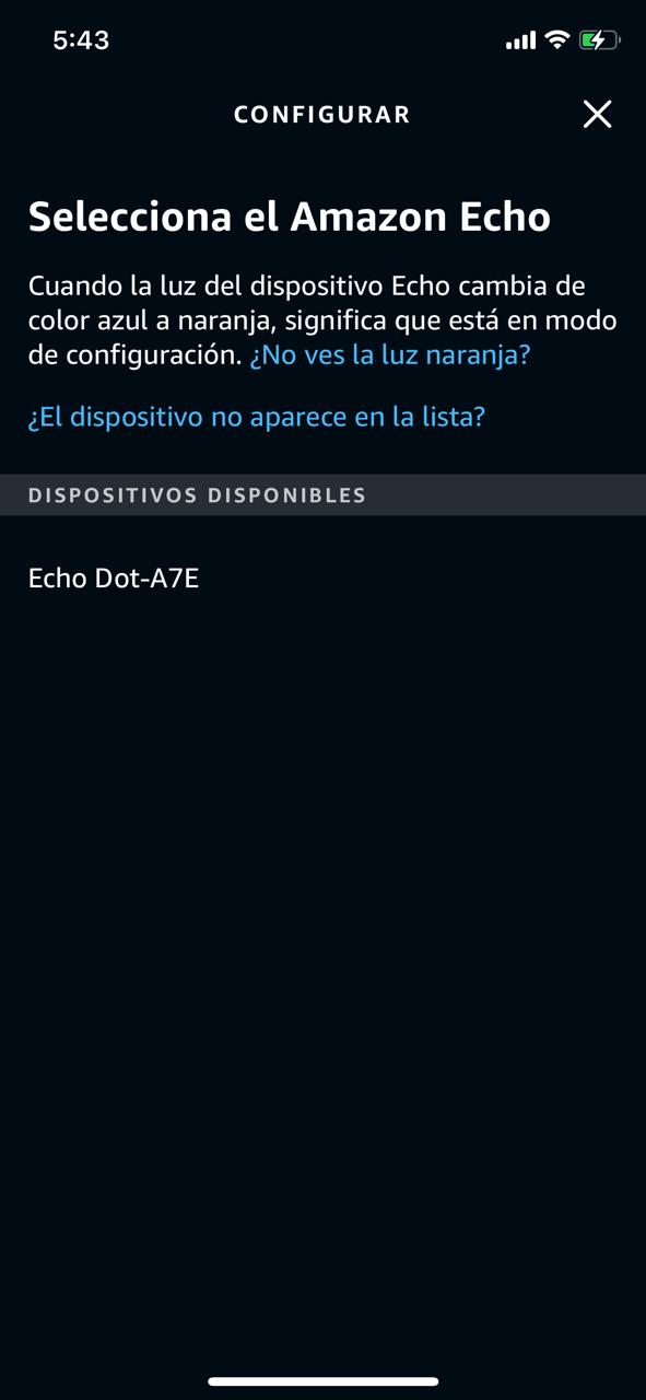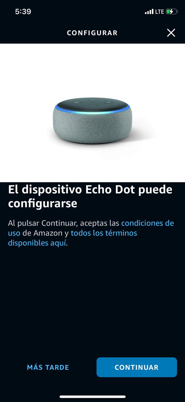Iniciamos la configuración de nuestra bocina Echo Smart Bluetooth Dot Tercera Generación, emitirá una luz de color naranja la cual nos indica que esta lista para iniciar a configurarla, únicamente seguimos los pasos que nos solicita la aplicación «Alexa».