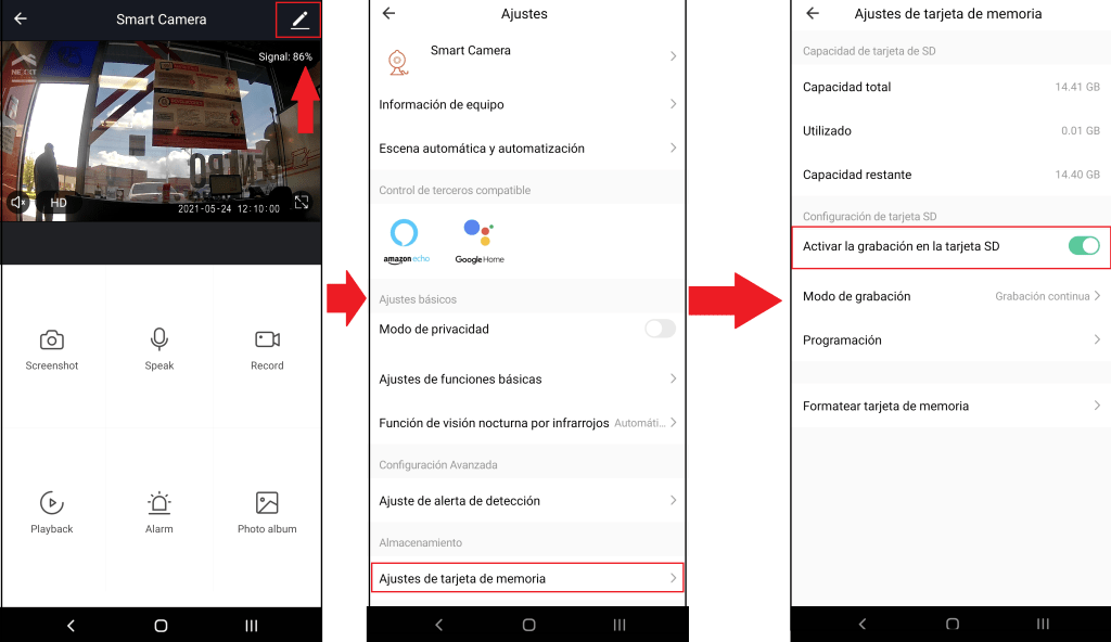 - Seleccionamos «Ajustes de tarjeta de memoria«, activamos la grabación en la tarjeta SD.