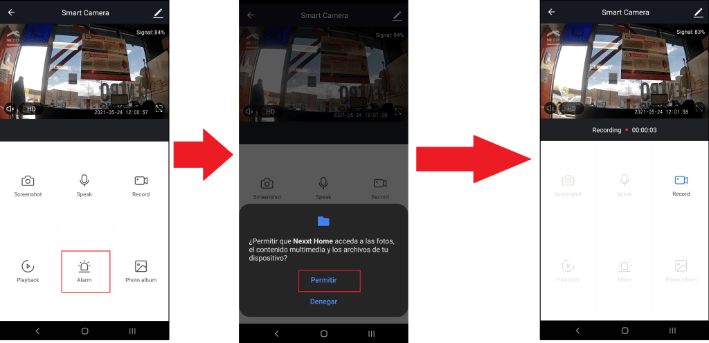 - Para grabar videos seleccionamos «Record«, permitimos el acceso al contenido multimedia del dispositivo.