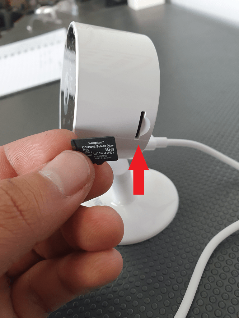 - La ranura para la memoria micro SD la encontramos a un lado posterior de la cámara, en este caso se instalara una memoria micro SD de 16GB la cual ya tiene que estar formateada antes de usar.