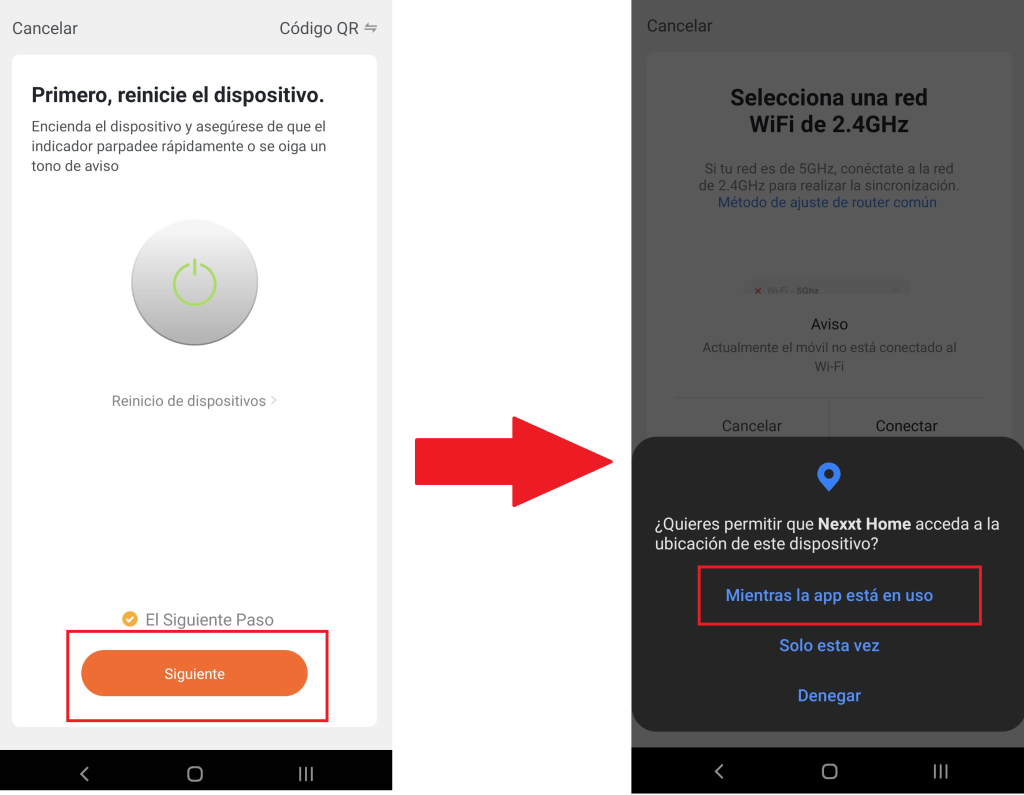 Nos solicitara acceder a nuestra ubicación (varia dependiendo del dispositivo), seleccionamos «Mientras la app está en uso«, conectamos nuestro dispositivo móvil a nuestra red WiFi la cual tiene que ser de 2.4Ghz ya que nuestra cámara no es compatible una red de 5Ghz.