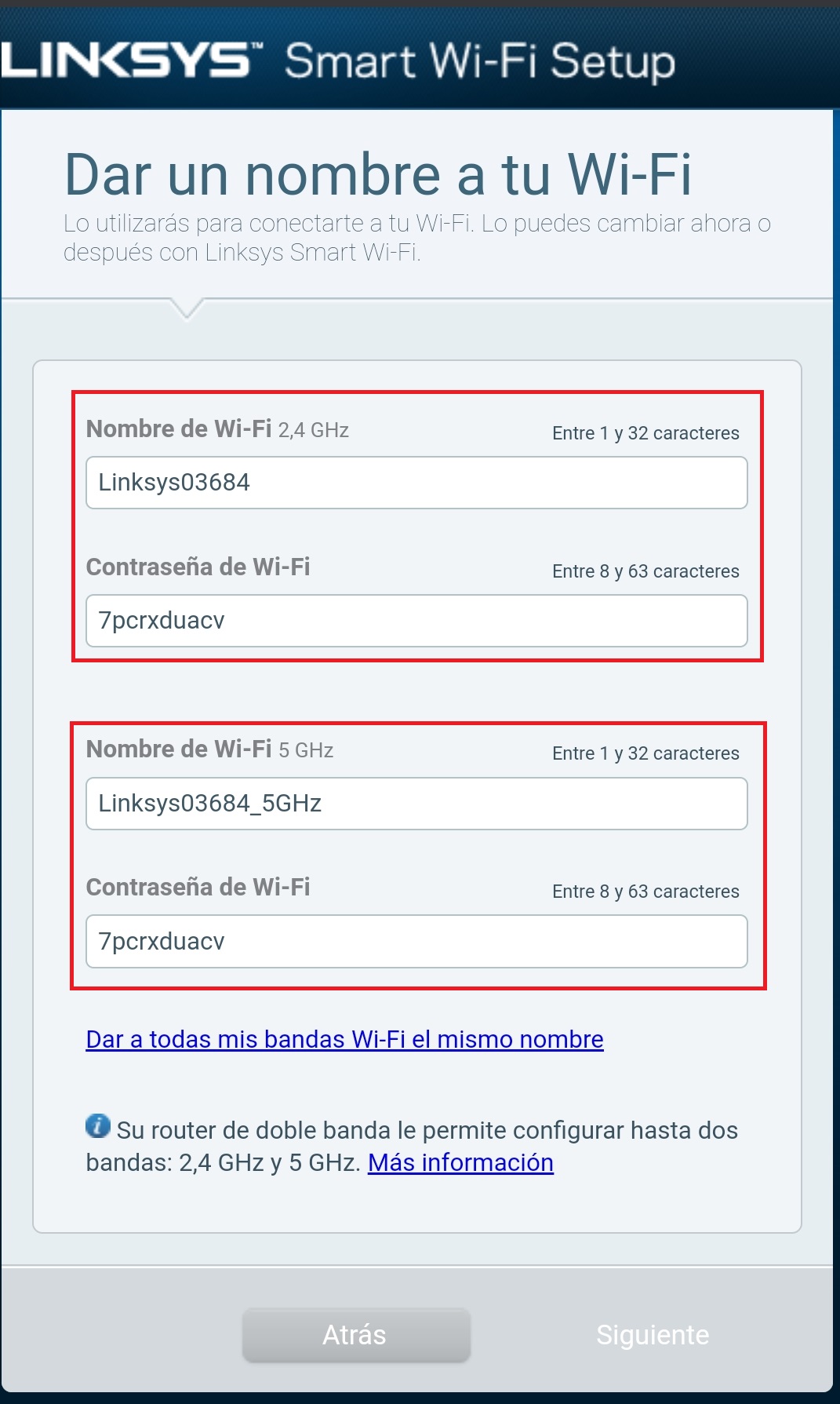 Nos mostrara el nombre que trae predeterminado para nuestro router. Si deseamos cambiar el nombre o la contraseña podremos hacerlo, de lo contrario lo dejamos tal y como esta y seleccionamos «Siguiente«. Esperamos a que se reinicie el router y se aplique los cambio realizados.