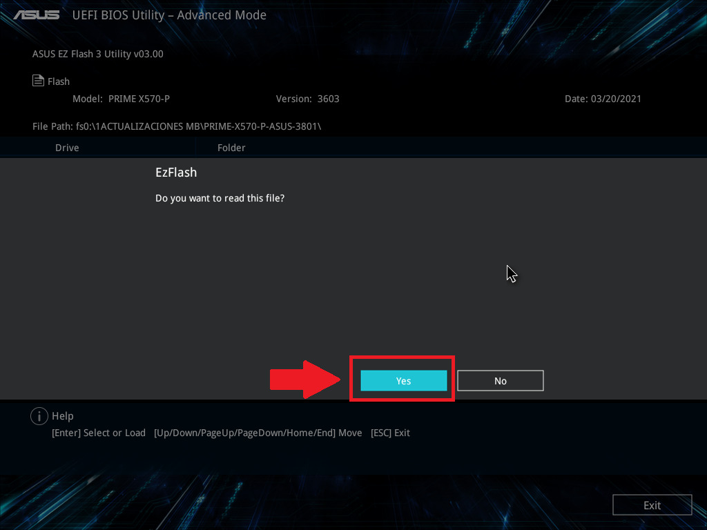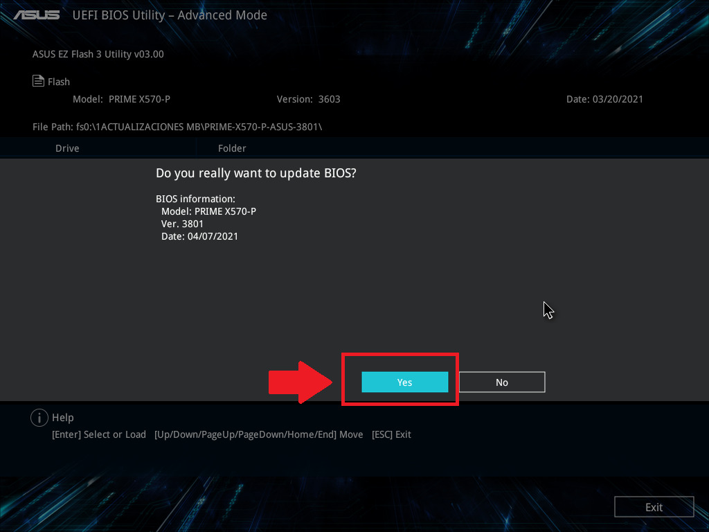 - Se nos mostrara la información de nuestra BIOS y se nos consultara si queremos actualizar seleccionaremos nuevamente “Yes”.
