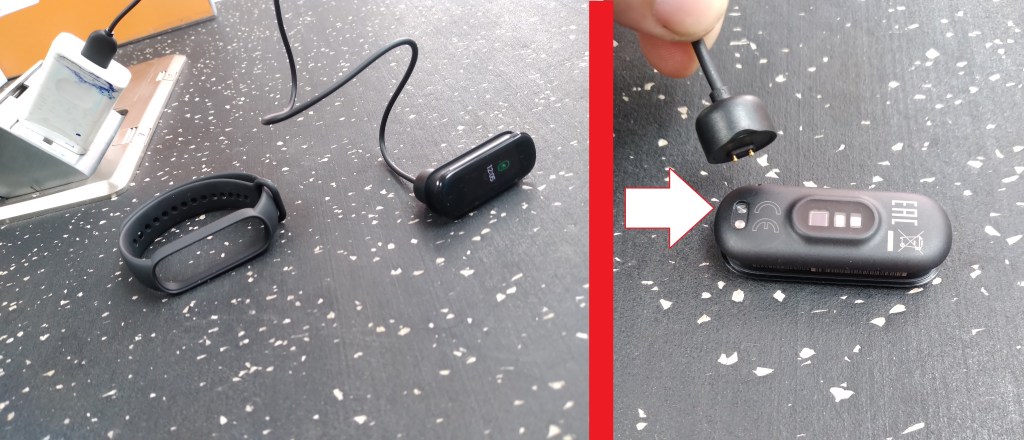 Retiramos el reloj Xiaomi de la Banda y realizamos el proceso de carga de nuestro reloj Xiaomi Amazfit Banda 5, conectando el cargador de fábrica a un adaptador de corriente.