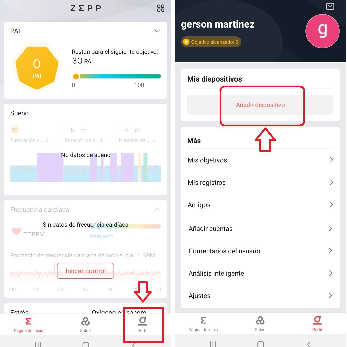 Ya habiendo ingresado sesión nos mostrará la plataforma de inicio de la aplicación “Zepp”, donde seleccionaremos el menú “Perfil” y luego “añadir Dispositivo”.