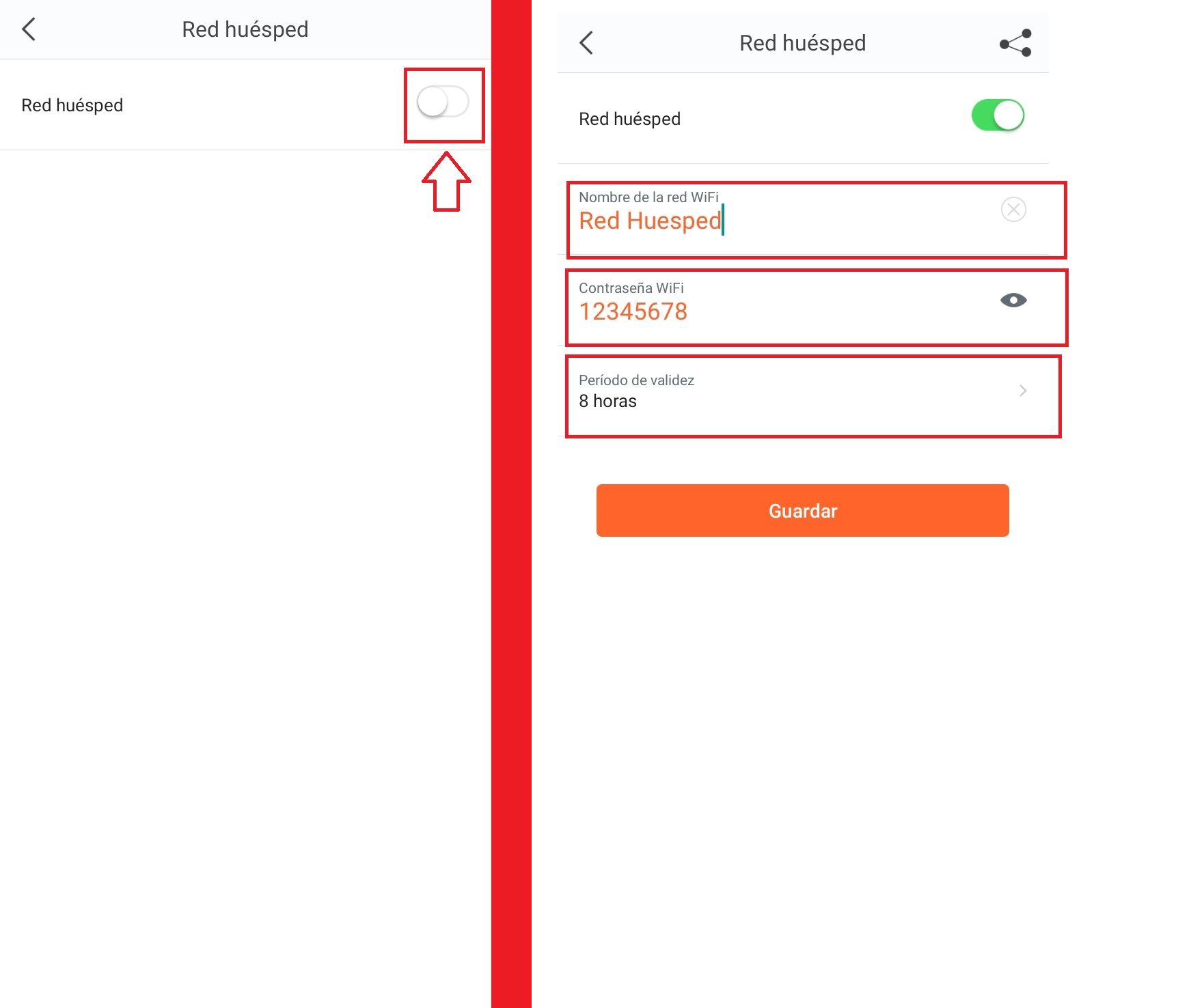 A continuación habilitaremos la opción red huesped y nos desplegara una lista de configuraciones las cuales podremos modificar. (Nombre de subred, contraseña y tiempo que permanecera activa la subred).