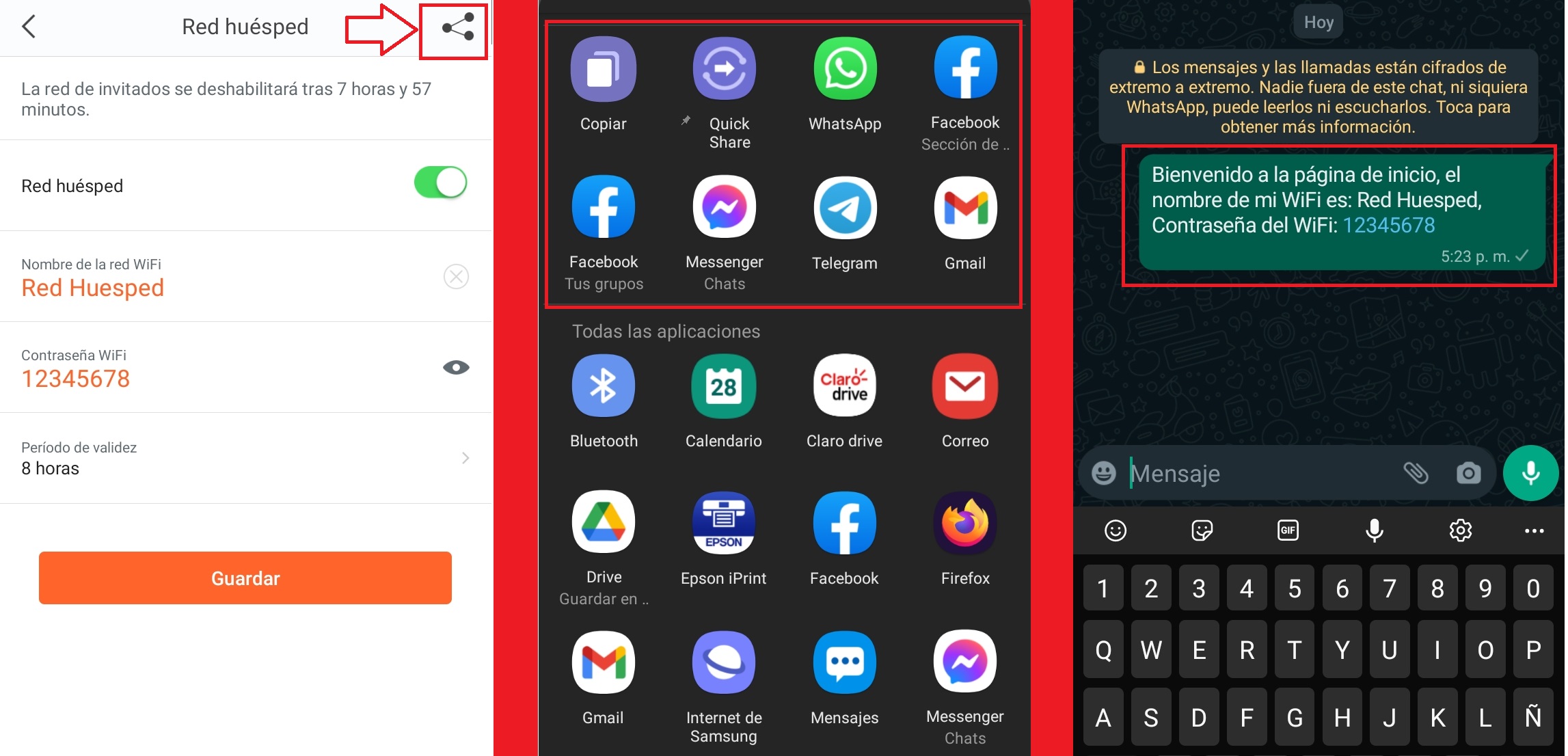 Luego de contar con nuestra red huésped activa, ingresamos nuevamente a las configuraciones de la red huésped donde podremos compartir las credenciales de acceso por medio de redes sociales, mensajes, correo electrónico, entre otros medios.