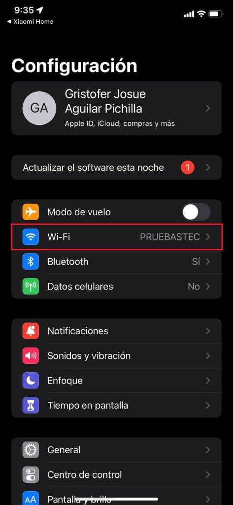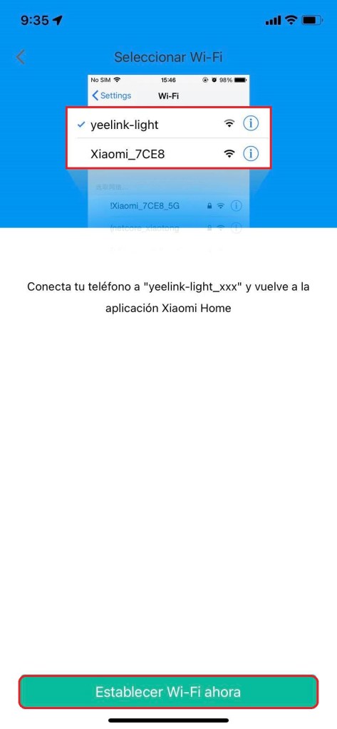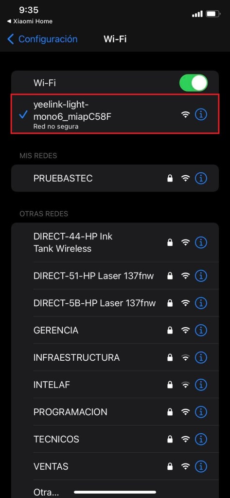 Ingresamos a las configuraciones WiFi en nuestro dispositivo móvil y seleccionamos la red WiFi que genera nuestra bombilla «yeelink-light«, luego de estar conectado a la red WiFi regresamos a la aplicación Xiaomi Home para continuar con las configuraciones.