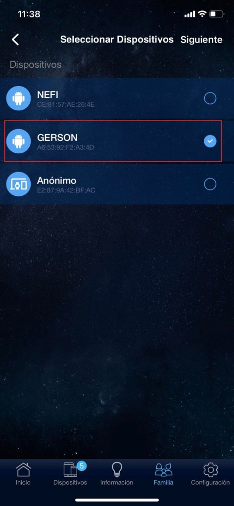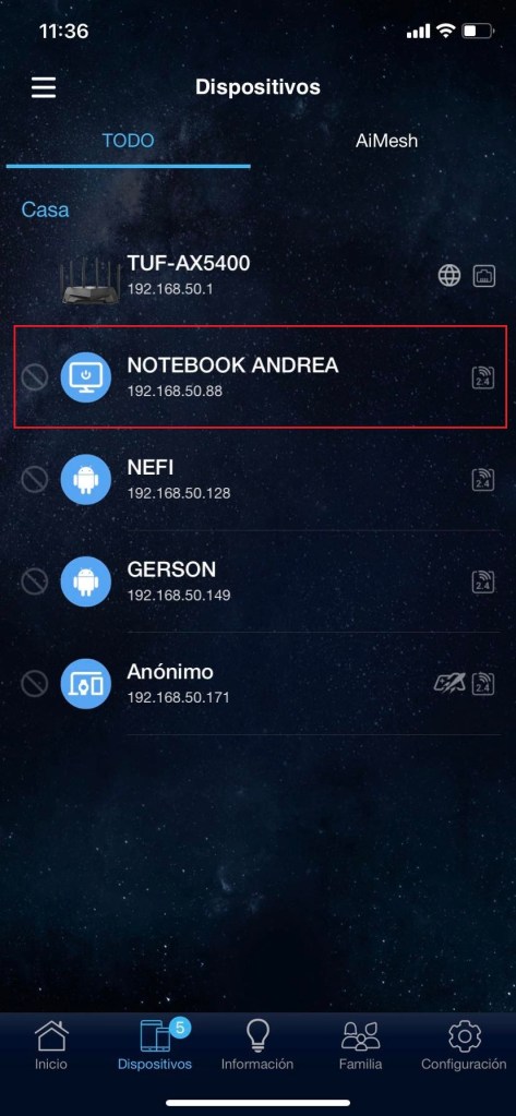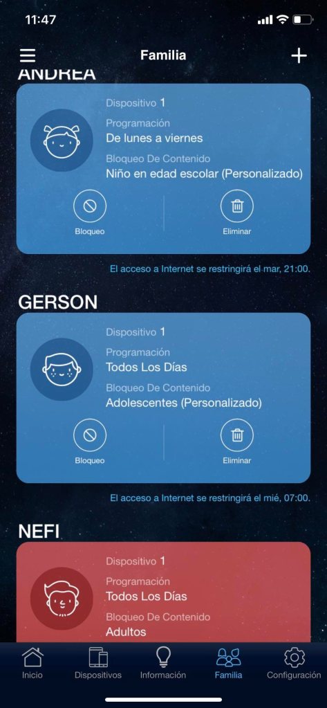Para poder administrar nuestros dispositivos con control parental tendremos que ir a la parte inferior en el apartado de «Familia», agregarlos y colocar un nombre para identificarlos. Seleccionamos cual es el dispositivo que utiliza y podremos programar que días puede conectarse a la red con horario de inicio y fin del día.