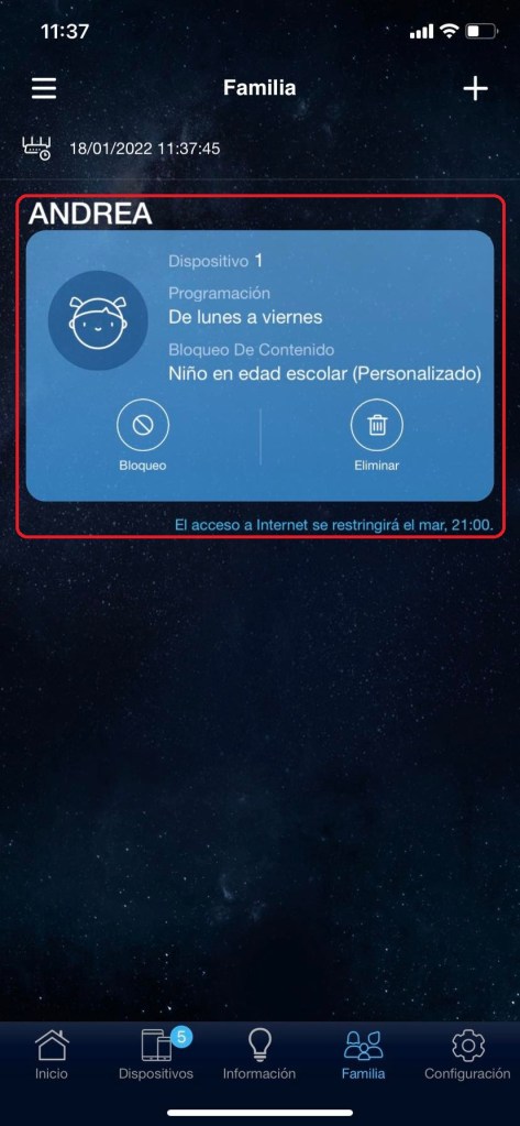 En el apartado inferior en familia tendremos acceso a ver todos los perfiles creados dependiendo la edad y horarios colocados.