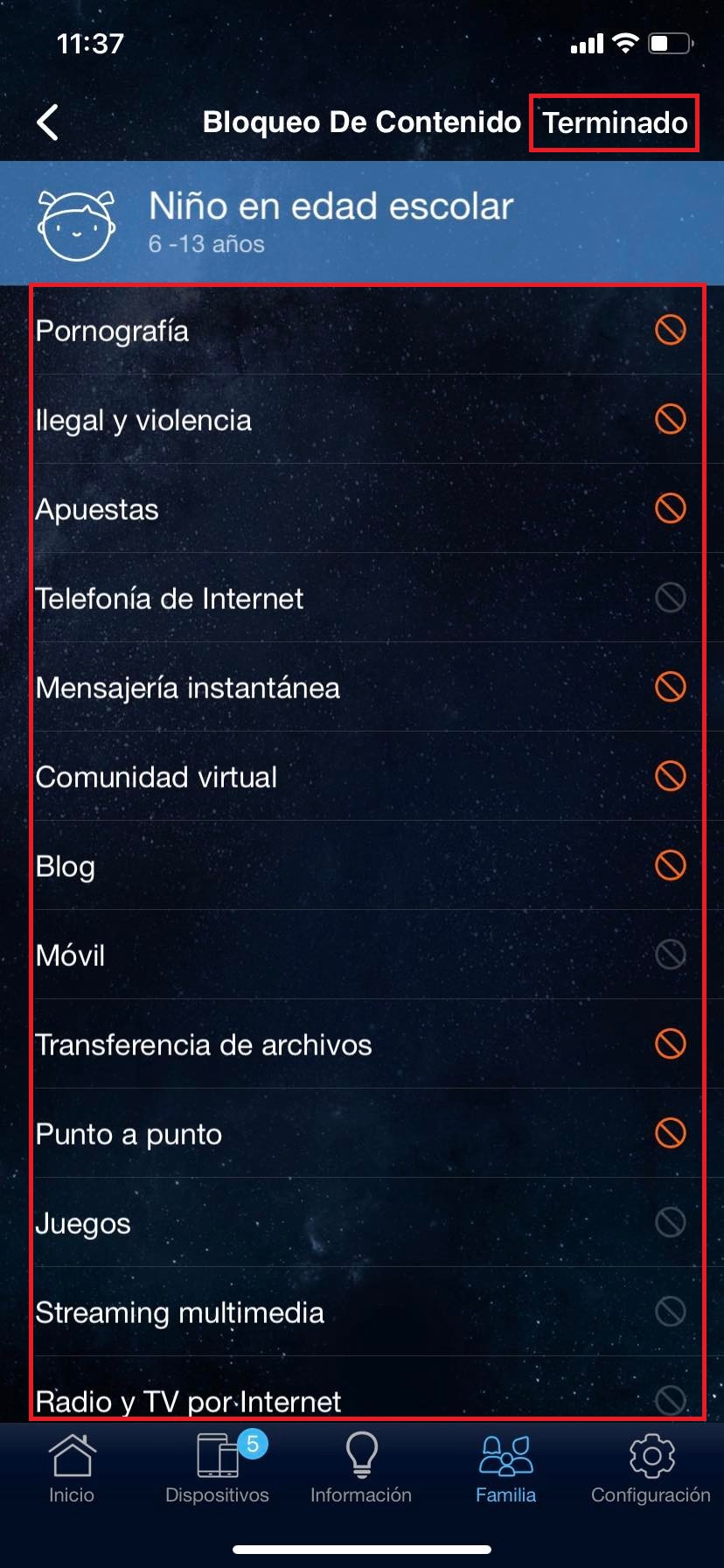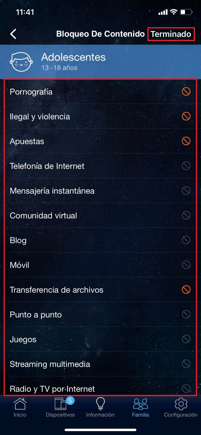 En el apartado inferior en familia tendremos acceso a ver todos los perfiles creados dependiendo la edad y horarios colocados.