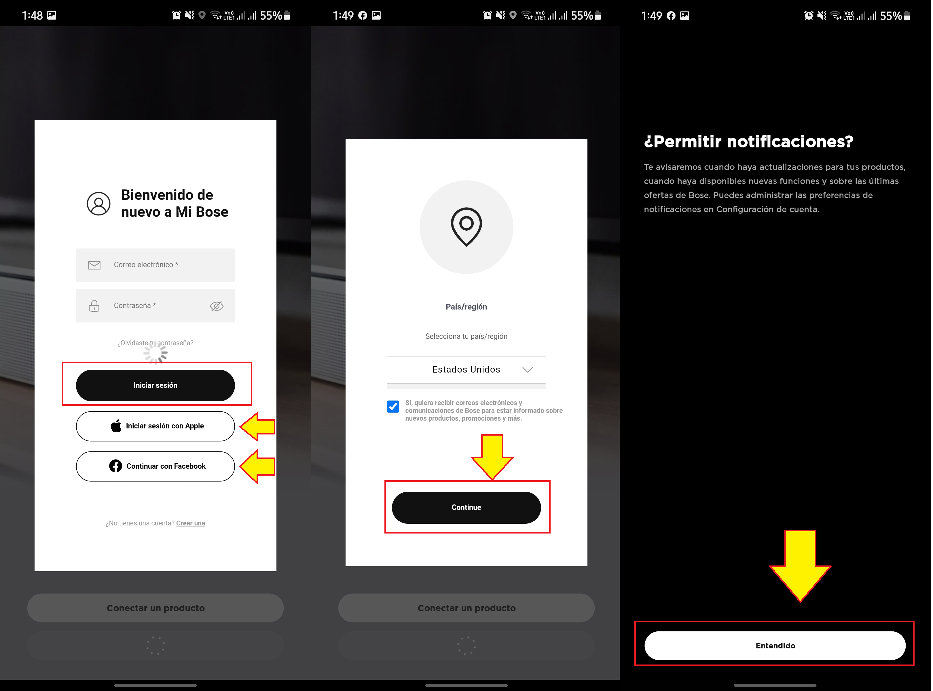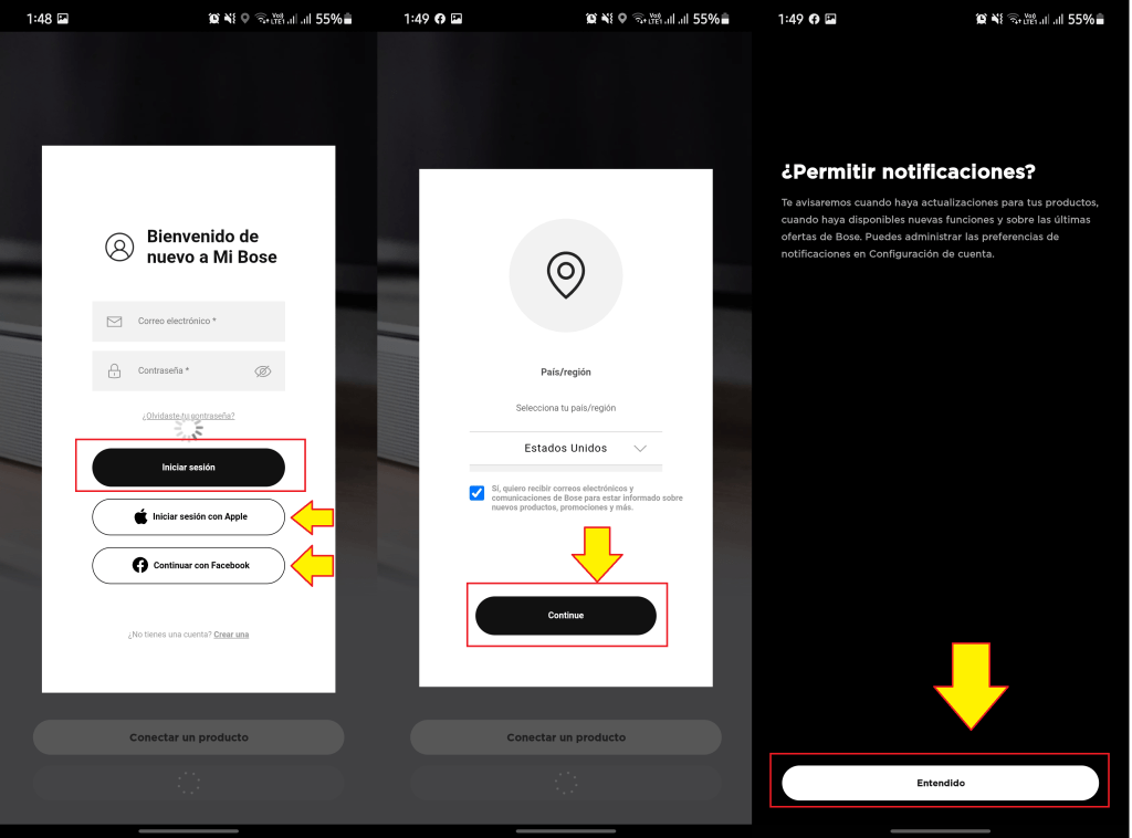 Una vez descargada la aplicación la abrimos e iniciamos sesión con los datos de nuestra cuenta bose. Si no tenemos cuenta bose podemos crear una. Continuamos con la configuración de la aplicación.