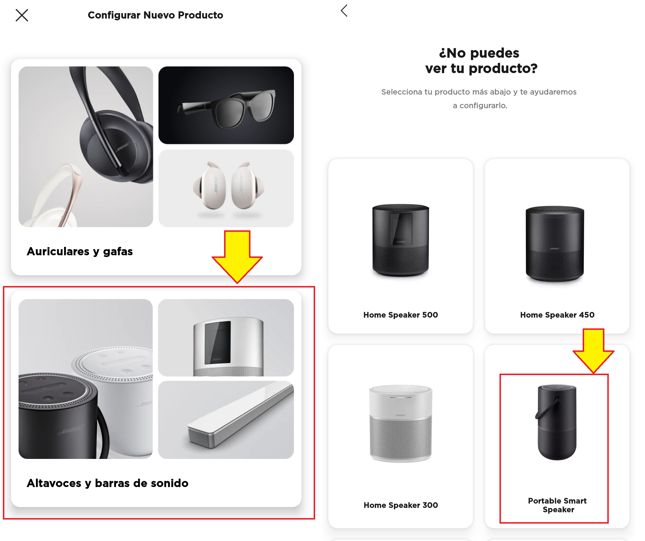 En la página principal de la aplicación le damos clic en configurar nuevo producto y luego en la opción de altavoces y barras de sonido. Aquí seleccionamos el modelo de nuestra bocina, en este ejemplo es “Portable Home Speaker”.