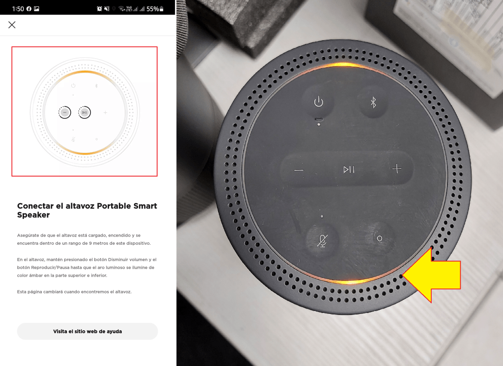 Nos mostrara unas instrucciones para poder iniciar la configuración de la bocina. Presionamos los botones Volumen – y Play/Pausa hasta que las luces de la bocina se pongan en color anaranjado.