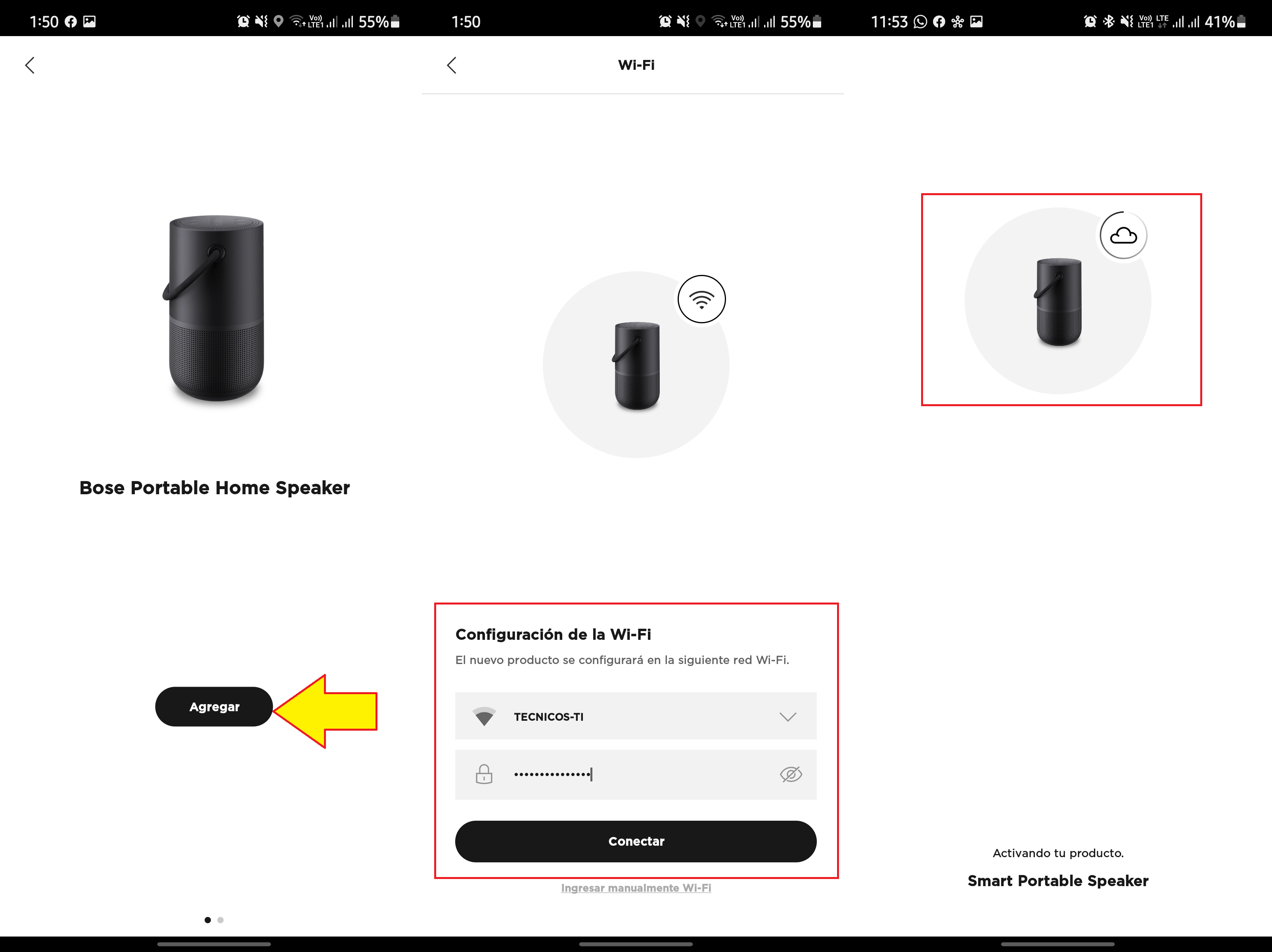 Continuamos con la configuración, ahora nos detectara la bocina, luego debemos colocar la contraseña de la red Wifi a la que nos conectaremos y esperamos a que termine el proceso de vinculación y activación de la bocina.