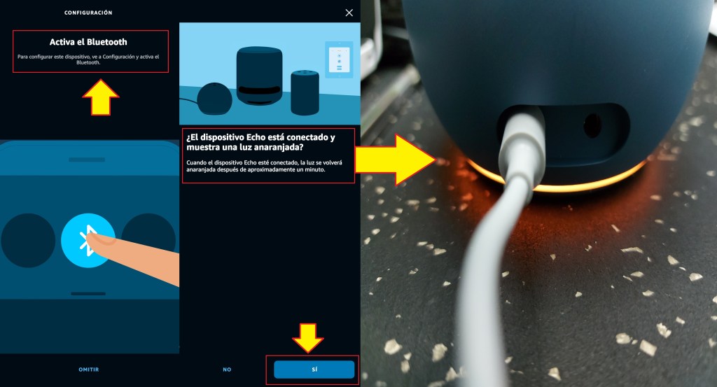 Nos pedirá que activemos el bluetooth y luego que conectemos la bocina a la corriente eléctrica mediante el trasformador que viene incluido y esperamos a que la luz de la bocina empiece a iluminarse en color anaranjado.