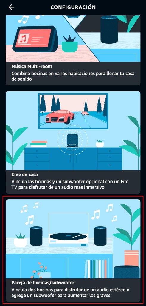 En la siguiente pantalla seleccionamos que modalidad vamos a utilizar. Puede ser Multi-room, cine en casa o pareja de bocinas/subwoofer. En este ejemplo utilizamos pareja de bocinas.