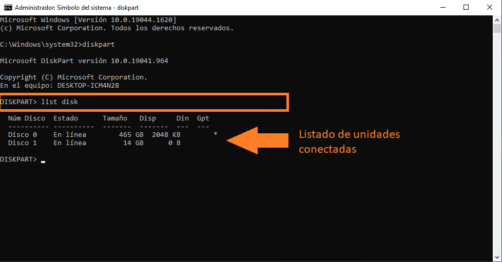 Escribimos el comando “diskpart” y presionamos tecla enter, luego escribimos “list disk” y presionamos enter nuevamente para visualizar la lista de discos disponibles.